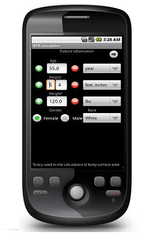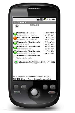 Accurate Kidney Function calculator If you are a nephrologist or a renologist, this app can simplify your life a bit. It determines a given patient39;s glomerular filtration rate using the MDRD, CKDEPI, or Mayo Quadratic methods. It also calculates the creatinine clearances which is used to estimate GFR using the regular method as well as the CockcroftGault formula. You can also choose to normalize these values with the patient39;s Body Surface Area. It is simple to use and made universal, allowing the practitioner to choose from a plethora of units for each of the parameters i.e. mgdL, mmolL, etc...