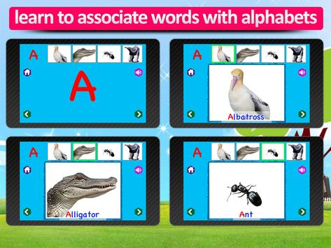 Here Animals are sequenced in such a way that their names are in the same flow as the alphabets, that is, A to Z. Animal ABC shows the name of the animal with the first character highlighted. You can even switch off display of animal name, reciting the name and the real animal sound.