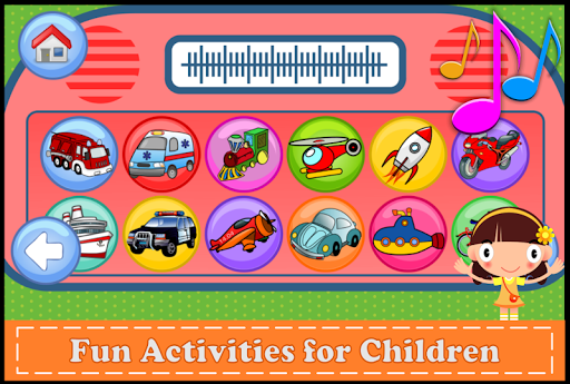 Vehicles for preschool kids category will help to children to recognize popular vehicles; car, bicycle, ambulance, airplane, truck, ship, firetruck, motorcycle, train, police car, helicopter, bus, rocket, van and submarine etc.