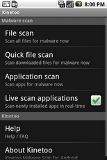 Kinetoo antivirus offers uptodate protection for your android handset.Kinetoo antivirus scans the file system and installed applications of your Android mobile device. A realtime antivirus scan monitors applications as they are installed. This free version contains a regularly updated database of mobile malware and spyware threats to better safeguard your mobile security Includes detection of quot;Fakeplayerquot;, quot;Geinimiquot;, quot;PJAppsquot;, quot;DroidDreamquot;, quot;TapSnakequot; and other spyware, quot;Fake security toolquot;, quot;Fake10086quot;, quot;zsonequot;, quot;HolyFkingBiblequot;, quot;BaseBridgequot;, quot;DroidDreamLightquot;, DroidKungFu, YZHCSMS, Plankton, quot;GGTrackerBattery Saverquot;, ZeusZitmo, GoldDream, jSMSHider, CruseWind, and 1OO86.net quot;China Mobilequot; fake AV malware, DroidDreamLight, HippoSMS, SndApps, GGTracker, LoveTrap, NickiSpy, NickiBot,Dogowar, RogueSPPush, AdSMS, GingerMaster, SpyEyeSpitmo Kare Log, Gone in 60, quot;fake sms Installerquot; fee deduction attack DroidKungFu updates including LeNa, Jimm ICQ, Carrier IQ, Arspam. quot;Eicarquot; suite included.FAQ: http:kinetoo.comsitefaqnLicense: http:kinetoo.comsitetermsofservice