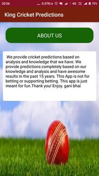 King Cricket Predictions app provides cricket tips for prematch also gives tips & predictions for entertainment in ODI, T20 and also for leagues like IPL, BIgBash, CPL, SPL. Our Tips are for fun and to enjoy.