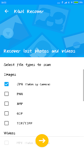 Kiwi Recover can recover the following file types: BMP, JPEG/JPG, PNG, MNG, JNG, GIF, MP4, AVI, MKV, MP3, OGG, OGM, WAV, FLAC, AMR, MP4A, PDF, SXD, SXI, SXC, SXW, ODT, ODG, ODS, ODP, DOCX, XLSX, PPTX, ZIP, JAR, APK, EPUB.