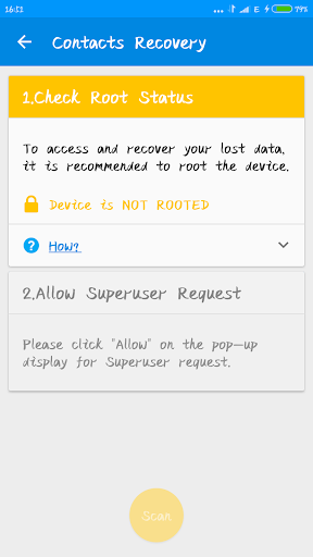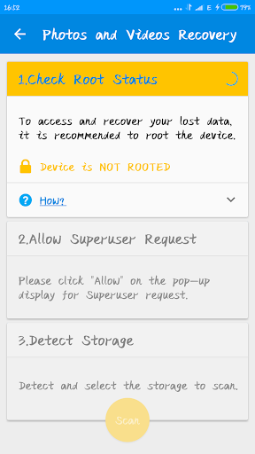 Note: if your device is not rooted, the app can only perform a "limited" scan for for deleted photos. To be able to search for other types of files, and to search your device's entire internal memory, the device needs to be rooted. On a non-rooted device, the app can only recover lower-resolution versions of your photos that it finds in your device's cache and thumbnail directories.
