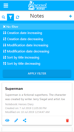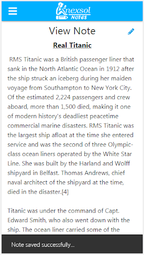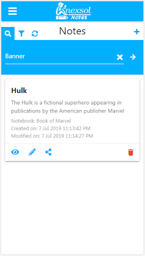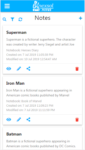 Knexsol Notes is a versatile note taking app where you can easily create new notes, view them, edit them, search / sort and share them with your friends via various sharing options available in your android device. Each note currently shows the creation time and modification time. Notes can be categorized by adding them to custom created notebooks. Currently the notes are saved locally on user's device only. More features like saving notes on server and multi device support with pc and lots more are coming soon
