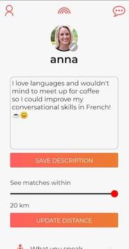 You can register or login and input your languages (what you speak and what you want to learn or improve). You are going to match with people who want to learn the language you speak and vice versa, and they are around your area as well. You have the option to chat with them, upload a photo or add description to your profile and update the languages.
