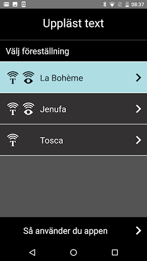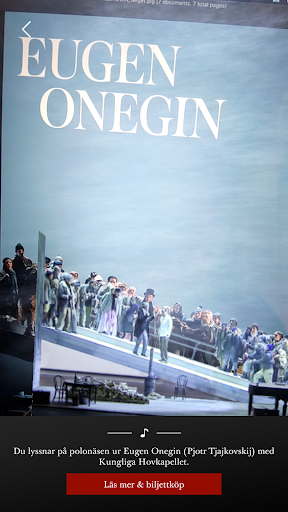 I appen kan du också få uppläst text och/eller syntolkning på Kungliga Operan vid utvalda föreställningar. Den är synkroniserad med Operans textmaskin och den upplästa texten startar automatiskt när du närvarar vid en föreställning. Du använder dina egna hörlurar.