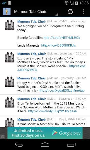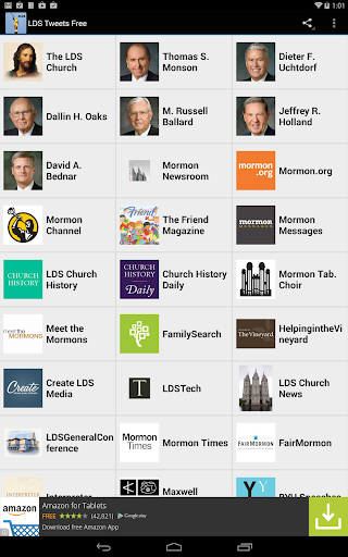 A convenient collection of Twitter feeds of interest to members of The Church of Jesus Christ of Latter-day Saints. Includes official accounts from the Church as well as others that are faith promoting. This is especially useful if you're interested in viewing LDS-oriented tweets but don't have a Twitter account or don't want to learn to use Twitter.