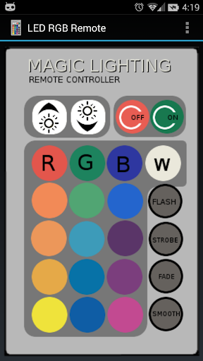 This app is for controlling the Chinese LED RGB Light Bulb or 24-Key 5M Strip Lights MagicLighting brand. As of v1.0.7, it will also work with the generic (Chinese) 24-Key LED RGB Strip light! The 48-Key version is not supported! (See the Settings page for switching)