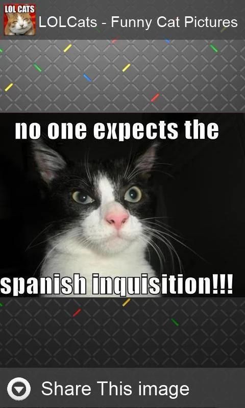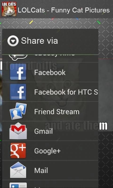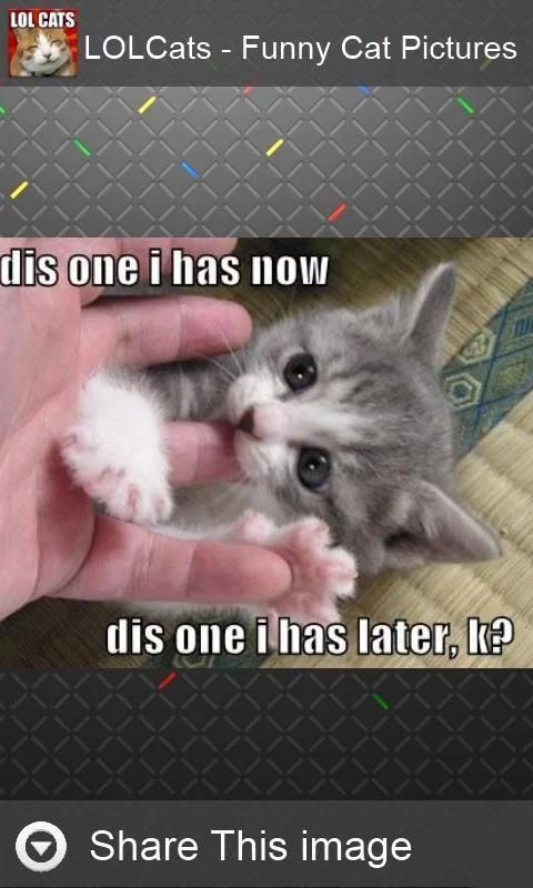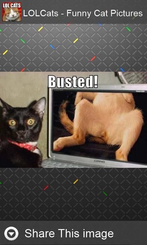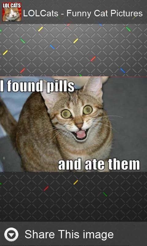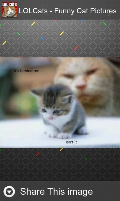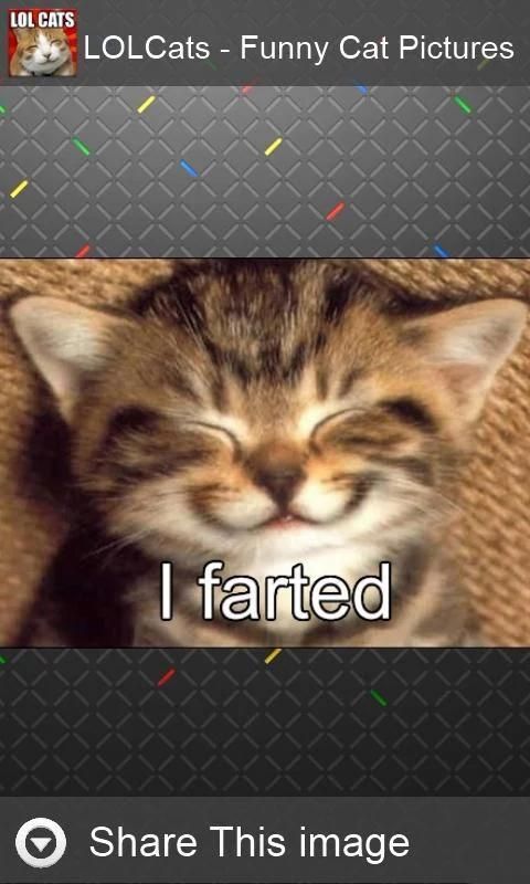 Don’t forget to tell your friends about LOLCats. You can share the funny cat pictures through Facebook, Twitter, G+, Email, SMS and even What’sup. It’s all available through your screen menu button. Don’t be shay to share the cats with friends.