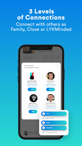 ● 3 Layers of Connections: Connect with others as Family, Close, or LYKMinded