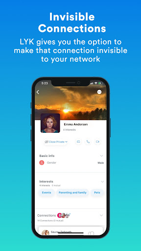 ● Invisible connection: When a user connects with another user as Close or LYKMinded, Lyk gives you the option to make that connection invisible in your network.
