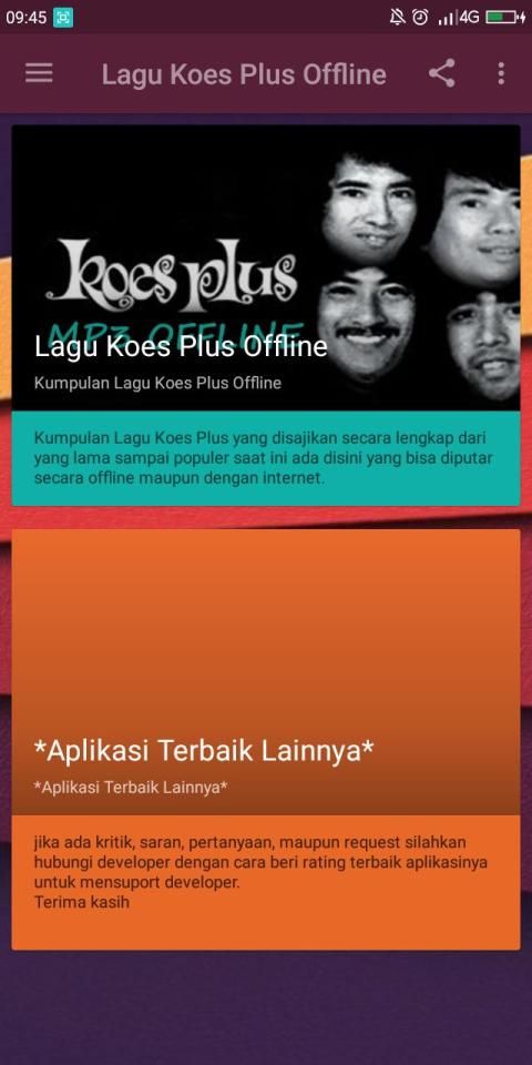 Jadi tunggu apa lagi ini dia aplikasi yang kalian cari selama ini, Buruan download Aplikasi Lagu Koes Plus Offline ini.