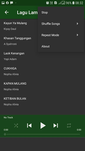 Dalam aplikasi ini anda dapat mendengar lagu-lagu yang dibawakan oleh Albi Erlangga, Nopha Alivia, Erwinardo, Edi Pulampas, Hila Hambala, Yopi Adam, Mega, Murti Dewi, A. Syahroni, Kiyay Daul, dan Bang Raden. Berikut adalah judul-judul lagunya: