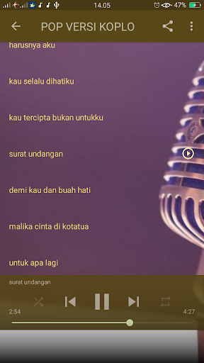 aplikasi pop kenangan versi koplo merupakan koleksi lagu pop keangan yang diringi dengan musik dangdut koplo sehingga dapat merubah sensasi alunan musiknya semakin mantap. aplikasi pop kenangan versi koplo ini tersedia dalam bentuk offline. jadi dapat diputar kapansaja tanpa sambungan internet