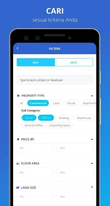 Hal yang paling utama adalah kamu bisa filter ingin mencari rumah (atau berbagai properti lainnya) yang dijual maupun yang dikontrakkan atau disewakan. Tersedia berbagai opsi filter lainnya seperti lokasi yang diinginkan, kisaran harga, jumlah kamar tidur, dan lain-lain.