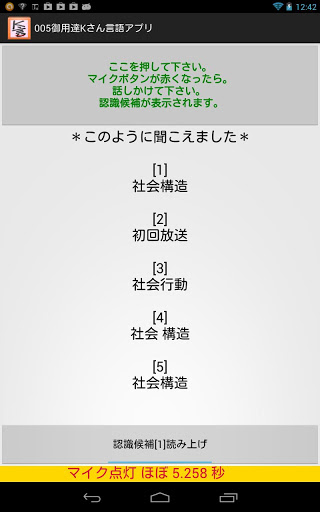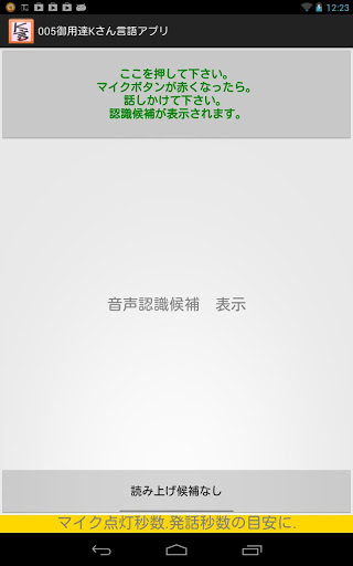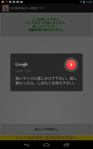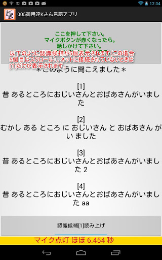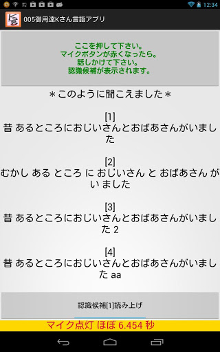Language Apps for Mr. K of spinocerebellar degenerationI was made ​​ this app for Mr. K that speak japanese I(tombiroid) am responsible for the rehabilitation of Mr. K..Mr. K has a disease called spinocerebellar degeneration.Speech has become indiscernible (hence dysarthria motility).I thought of using the voice recognition google and I want to make an app for him.Mr. K said, speech synthesis is not necessary.I wanted to place the voice synthesis function button, I was placed with the consent of Mr. K.For people who have symptoms such as Mr. K, we ask you to speak slowly.However, it is to have symptoms that do not speak slowly.With this app to Mr. K"I am k." and he spoke into the microphone.Since the recognition result is too far, he was repeatedly folded speak into the microphone. This is because I think the ambiguity of the utterance is affecting the speech recognition result.Of course, the speech recognition result of the current google I will never say it enough.Gradually, and as the result of the way you want voice recognition, he is spoken slowly.Speech synthesis who have tried (free), aques talk with (surcharge) N2's KDDI.I think that should not be a burden on those who are free, so if you use this app for the time being N2.Since the use of speech synthesis of Japanese, required to install the (tts) voice synthesis engine.App dedicated patients, we must create just for that person.Large buttons, simple function.keyword : speech therapist PT OT ST language disorders dysarthria aphasia rehabilitation motility spinocerebellar degeneration tombiroid  tts TextToSpeech tombiroid speech recognition speech synthesis