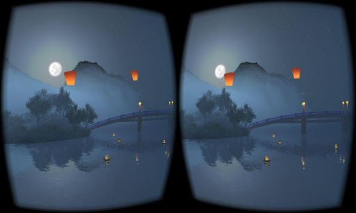 This virtual reality app represents a typical night view of Lantern Festival celebration. Serene mountains lit by full moon reflect in river, and flickering lanterns are both in the air and on the surface of the water.