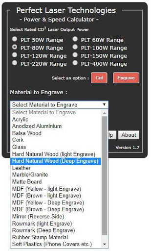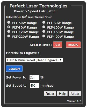 To use this calculator, click your Rated Laser Output Power, then select Cut or Engrave, and then the material you intend to use.