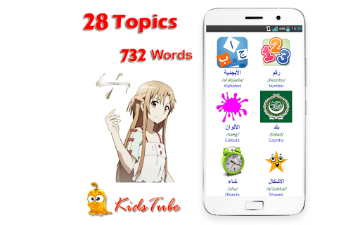 , you can recognize Arabic Alphabet, animals, fruits, color, food, numbers....