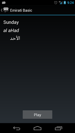 3. On the phrase detail page, the Emirati phrase is shown alongside its pronunciation and the equivalent English phrase. Press the Play button to hear the audio pronunciation by a native speaker.