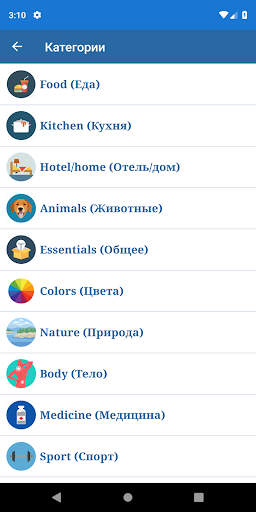 English vocabulary can show offline more than 2000 most popular English words and high-quality real pictures in 21 categories Food, Kitchen, Hotel/home, Animals, Essentials, Colors, Nature, Body, Medicine, Sport, Devices, Clothes, Transport, Mathematics, Construction, Musical instruments, Army, School, Professions, Actions, Places, and others.