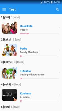 "People" "Family Members" "Getting to know others" "At school" "Countries and Languages" "Reading and writing" "Numbers" "The time" "Days of the week" "Yesterday – today – tomorrow" "Months" "Beverages" "Activities" "Colors" "Fruits and food" "Seasons and Weather" "Around the house" "House cleaning" "In the kitchen" "Small Talk 1" "Small Talk 2" "Small Talk 3" "Learning foreign languages" "Appointment" "In the city" "In nature" "In the hotel – Arrival" "In the hotel – Complaints" "At the restaurant 1" "At the restaurant 2" "At the restaurant 3" "At the restaurant 4" "At the train station" "On the train" "At the airport" "Public transportation" "En route" "In the taxi" "Car breakdown" "Asking for directions" "Where is ... ?" "City tour" "At the zoo" "Going out in the evening" "At the cinema" "In the discotheque" "Preparing a trip" "Vacation activities" "Sports" "In the swimming pool" "Running errands" "In the department store" "Shops" "Shopping" "Working" "Feelings" "At the doctor" "Parts of the body" "At the post office" "At the bank" "Ordinal numbers" "Asking questions 1" "Asking questions 2" "Negation 1" "Negation 2" "Possessive pronouns 1" "Possessive pronouns 2" "big – small" "to need – to want to" "to like something" "to want something" "to have to do something / must" "to be allowed to" "asking for something" "giving reasons 1" "giving reasons 2" "giving reasons 3" "Adjectives 1" "Adjectives 2" "Adjectives 3" "Past tense 1" "Past tense 2" "Past tense 3" "Past tense 4" "Questions – Past tense 1" "Questions – Past tense 2" "Past tense of modal verbs 1" "Past tense of modal verbs 2" "Imperative 1" "Imperative 2"