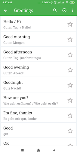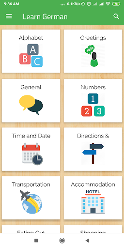 Learn German - Lerne Deutsch contains over 2000 commonly-used German phrases and vocabularies for travelers and beginners in 18 categories.