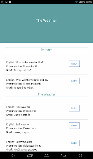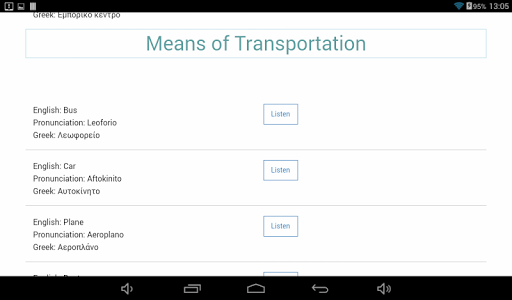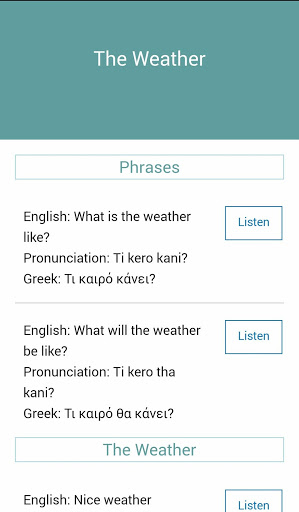 The content is divided into several categories based on the topic and it consists of phrases and dialogues with the English meaning, the Greek translation and an audio file to listen to the pronunciation.