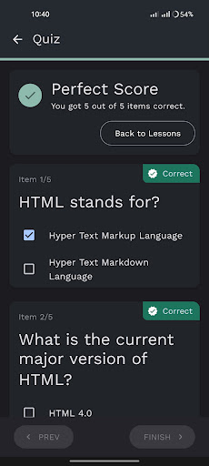 Every lesson is followed by quizzes that improve your Learning Progress.