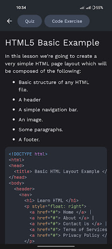 In every lesson, there are explanations, examples with the Try It Yourself functionality that help you effectively learn to code HTML.
