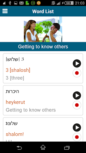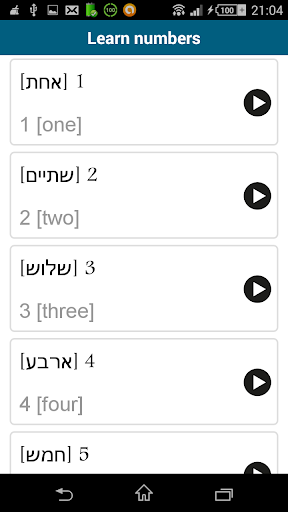 Learn Hebrew! "Hebrew 50 languages" (www.50languages.com) contains 100 lessons that provide you with a basic vocabulary. This free app has 30 lessons. With no prior knowledge, you will learn to fluently speak short sentences in real-world situations in no time.