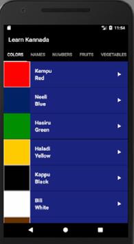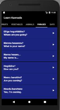 Use this app to learn basic Kannada phrases, colours, numbers, animals, fruits, vegetables, days of the week and relationship names. App also includes audio capability to help with Kannada pronunciation.