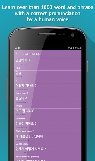 Learn Korean App will teach you the most commonly used words and phrases you can learn over than 1000 word and phrase with a correct pronunciation by a human voice.