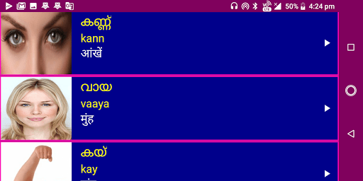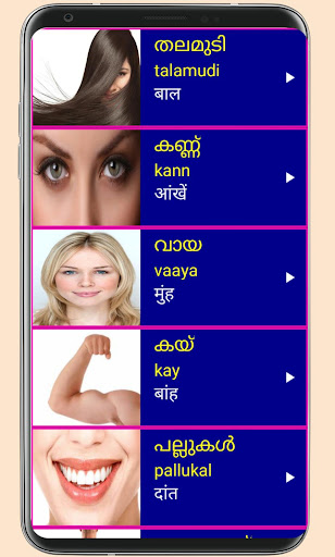 Malayalam words and sentences with hindi meanings are provided under many useful categories to Learn Malayalam from hindi effectively. To learn Spoken Malayalam from hindi easily , Clear picture with clear audio are provided for all Malayalam words .