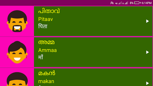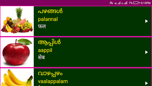 1. Each Malayalam word has clear image and audio pronunciation to make Learning Malayalam from Hindi Easy. Every Malayalam word has hindi meaning.
