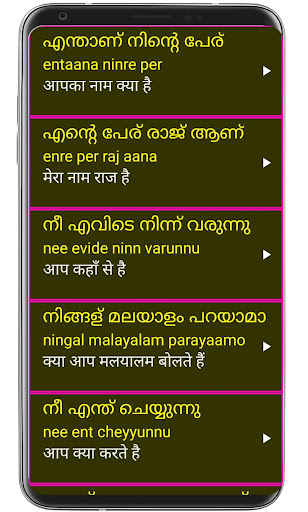 Download Learn Malayalam from hindi app now to start learning Malayalam from hindi and Reach your goal of Speaking in Malayalam . Hindi meanings are provided for all Malayalam words and sentences.