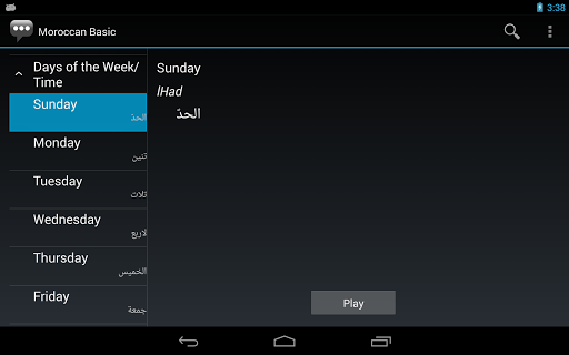 3. On the phrase detail page, the Moroccan phrase is shown alongside its pronunciation and the equivalent English phrase. Press the Play button to hear the audio pronunciation by a native speaker.
