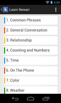 General Conversation, Relationships, Foods, Color and Animal Names and many more. Besides giving different words/phrases, it also provides their respective meaning in English, Nepal Bhasa Devanagari, Nepal Bhasha Romanized and Nepali.