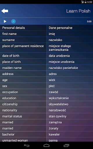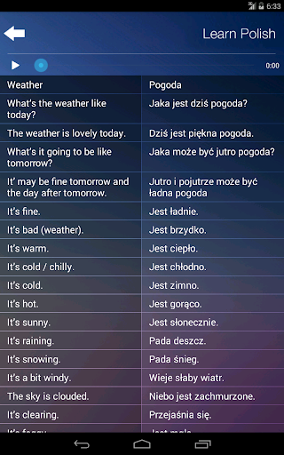 The most essential words and phrases of the language, each with native speaker audio. Perfect travel app! All audio is downloaded to the device and accessible even in airplane mode or without expensive international roaming fees.