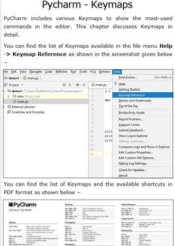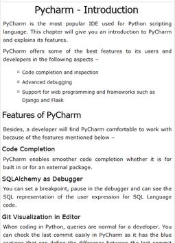 Pycharm Quick Guide - Learn Pycharm in simple and easy steps starting from basic to advanced concepts with examples including, Introduction, Installation, Understanding Basics, Keymaps, Shortcuts, Omni, Macros, Micros, Improving and Writing Code, Console, Interpreters, Debugging and Breakpoints, Integration of Version Control, HTML and CSS Integration, JavaScript Support, Tips, Database Tools, Exporting Data, Web Frameworks, Django, Pyramid, Flask.