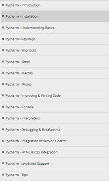 Pycharm, Tutorial, Introduction, Installation, Understanding Basics, Keymaps, Shortcuts, Omni, Macros, Micros, Improving and Writing Code, Console, Interpreters, Debugging and Breakpoints, Integration of Version Control, HTML and CSS Integration, JavaScript Support, Tips, Database Tools, Exporting Data, Web Frameworks, Django, Pyramid, Flask.