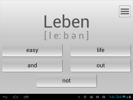 The program displays a random German word, along with its variants and a translation into English (or Russian). A pronunciation guide will also appear under the word to help you learn to say it correctly. The program will keep showing you each German word, until you succeed in learning it. The app considers that you’ve internalized and learned a word after you’ve translated it correctly five times in a row, and will then take that word out of the learning cycle.