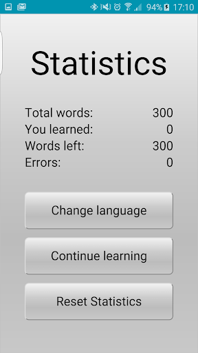 The app has a statistics menu which shows how many words you’ve learned, how many words you have left to learn, and how many mistakes you made and are allowed to make before the German words are considered to have been learned. You can reset the data statistics, change the native language of the app, or reset the German language learning process at any time.