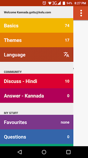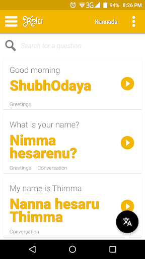 Frequently used sentences in Kannada, Hindi, Tamil, Telugu, Bengali, Marathi, Malayalam, Gujarati, Nepali, Assamese, Havyaka are grouped under conversation themes like greetings, shopping etc. The sentences are printed in English and you can also play the sound to know the pronunciation. The sentences are simple and based on the way the languages is spoken everyday and not dictionary language. You can favorite frequently used sentences for easy access. You can also search the Kelu community for the text you want. You can also ask experts to help you with any translation.