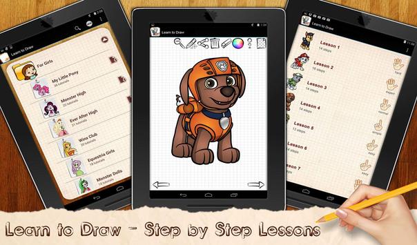 What could be more fun than spending time with your favorite Paw Patrol characters and comic books "Paw Patrol"? They are so cute and funny so let’s draw them! So why not combine the pleasant pastime and the educational process and learn how to draw all the characters that you love so much? We invite you to draw all of your favorite characters in a new mobile application for step by step drawing! ! Draw the beautiful pictures of animals by you own, because it's so easy and fun. Download «Paw Patrol» on your mobile phone or tablet and you will get access to an extensive catalog of drawing lessons. Choose any character and you will learn how to draw Rider, Sky and Everest perfectly beautiful.