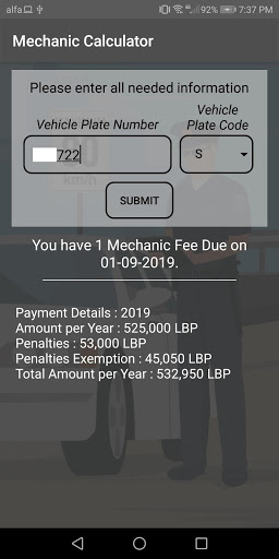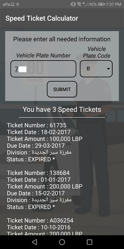 The Lebanon Car Tickets App is free to use, the user will have to provide his car plate number and benefit from the three available features : Speed Ticket Calculator, Park Meter Tickets, and Mechanic Fees Calculator.