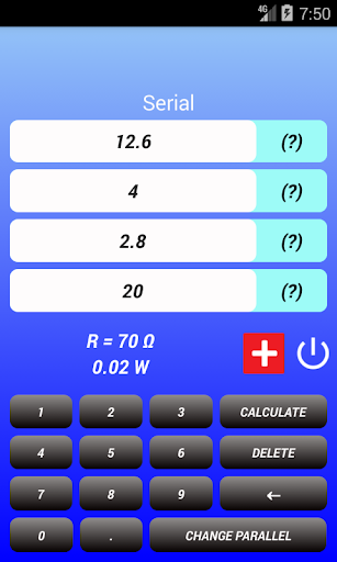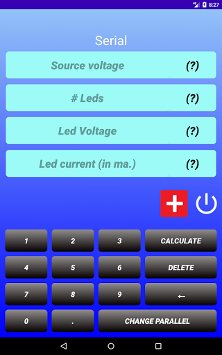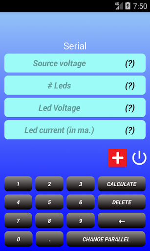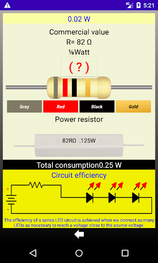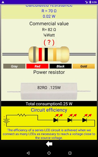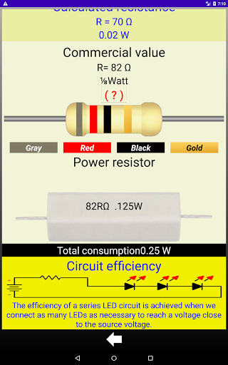 We have added a pie chart showing the efficiency of the circuit, the red zone indicates the energy consumption in the resistor, the green zone shows the energy consumed in the led. Really calculate the resistance for your leds in series or parallel, just enter in the fields the source voltage values, the number of leds, led voltage, the led current, touch calculate and you will be able to see the result immediately, If you want to see additional information, touch the button, then you will see the details of the circuit, such as the pie chart, the calculated resistance, commercial value, colors of the bands, power required, and total consumption of the circuit.