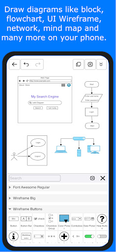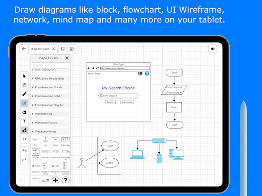 You can use the offline mode to draw diagrams. You can use smart drawing mode to simply sketch and get high quality diagrams like flowchart, block diagrams, system architecture and mindmaps. You can also drag drop shapes from the shape library to create diagrams like UML, Network, UI Wireframe, flow chart, organizational chart, business process diagram, venn diagram, mind maps and any kind of illustrations.
