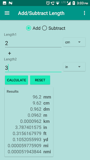 Also has feature to add or subtract lengths in any of given length unit . Result is displayed in all length unit formats.