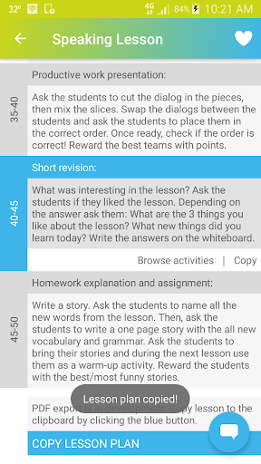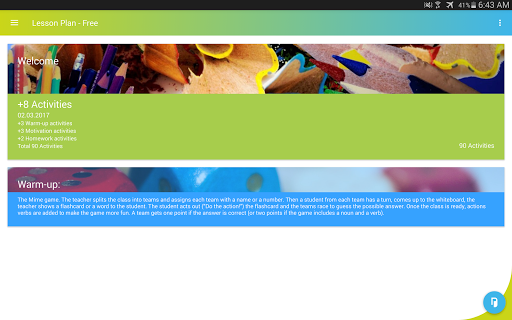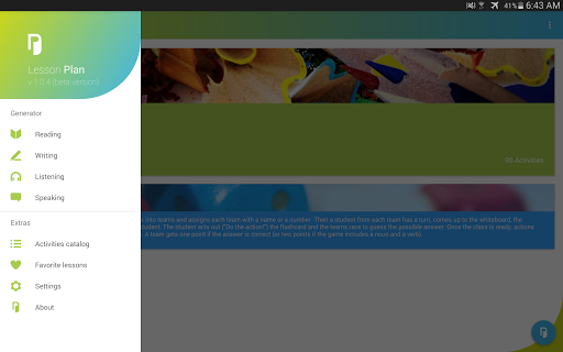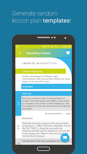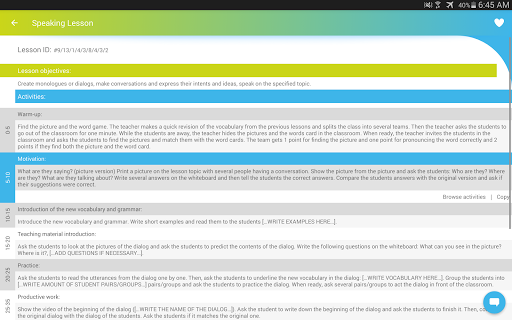 Lesson Plan is an application that generates 50-minute English lesson plans templates (with a set modern methodology structure). All the lesson parts are made to fit almost all (cross-grade) student levels. Each lesson part consists of 9 randomly generated fun ESL activities.